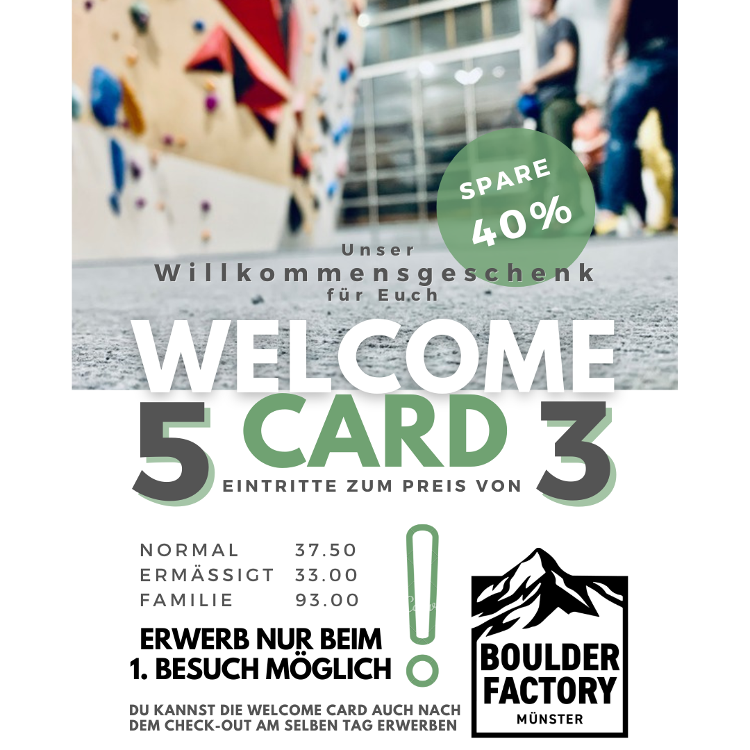 Sollten wir dich erst von uns überzeugen müssen, kein Problem, du kannst die Welcome Card auch unmittelbar nach deiner 1. Bouldersession bei uns noch kaufen.